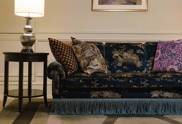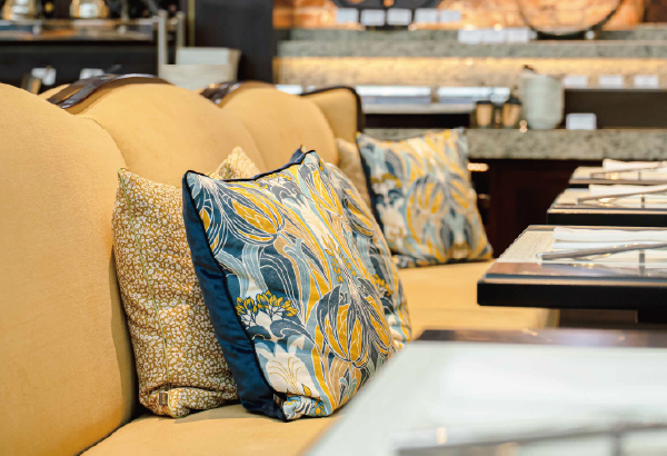 1月からは、4Fアトリウムのすべてのクッションがリバティファブリックに。数種類のクッションは、どれも店内の雰囲気に合わせて製作されたオリジナル。一般に流通していないインテリアファブリックならではの上質さと存在感によって、アトリウムがさらに印象的な空間になりました。ご利用時はぜひこの美しさに触れてみてください。