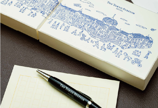 メモ用紙とボールペン、ステッカーが入った文豪セット。数々の文豪と縁のある東京ステーションホテルならではのオリジナルグッズとして誕生以来、人気No.1アイテムとして親しまれてきました。それがこの度、駅舎デザインのボックスに入ってリニューアル。さらに姉妹アイテムとしてメッセージカードセットも仲間入り。2つの箱を並べると、そこに描かれているのは宿泊客やスタッフ、結婚式をしている新郎新婦の姿・・。開業当時から現在へ続くストーリーが感じられる、楽しい仕掛けになっています。