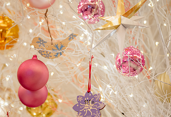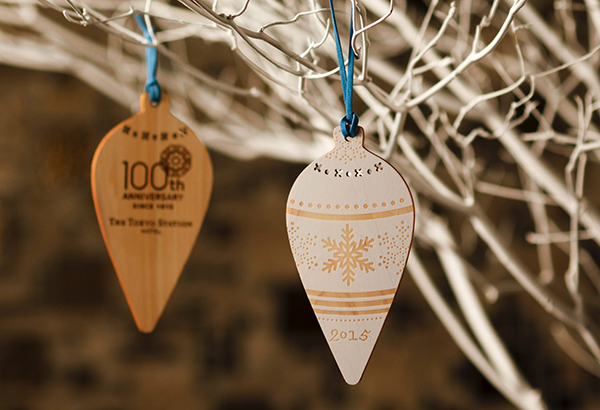 毎年デザインが変わる、寄付返礼のオーナメント。楽しみながら社会貢献ができるとコレクションしてくださる方も増えてきました。今年は「110」とくり抜かれた特別バージョン。ホテルを象徴する花ともいえる「クレマチス」を象っています。実はこの木製オーナメントには、森が成長していくために必要な手入れから生じる間伐材を使い、木工品を製作することで木にまつわる産業の活性に繋がれば、という思いも込められています。