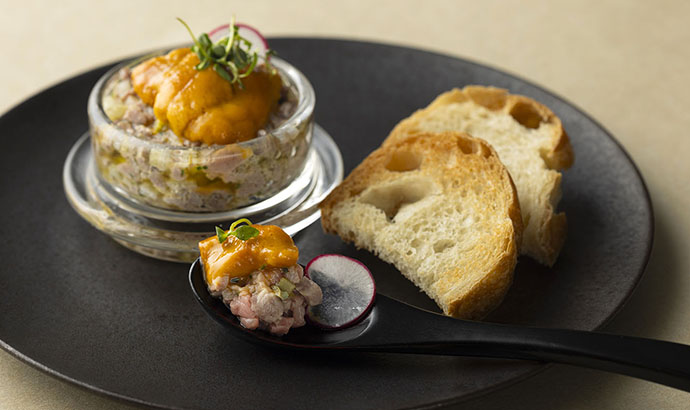- 全国各地から厳選した食材の意外な組み合わせ。フレンチの技法に新しさを加えた〈ヌーベルキュイジーヌ ジャポネフレンチ デギュスタシオン〉です。7品+チーズまたはデザート。
