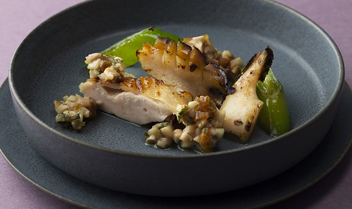 ・蝦夷鮑と名古屋コーチンのグリエ 各種きのこと梅糀のコンディマン添え