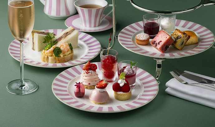 - モーヴピンクが午後のひとときを彩るアフタヌーンティー。華やかなテーブルウェアに盛られたスイーツやセイボリーで、落ち着いた大人のエレガンスに包まれるティータイムをお楽しみください。1日20名様限定。