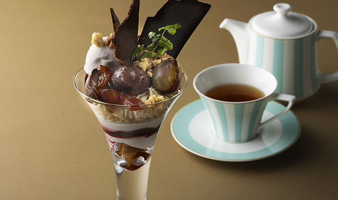 - 和栗とフランス栗の芳醇な風味を、洋梨とカシスが優雅に引き立てる上質な秋のパフェです。