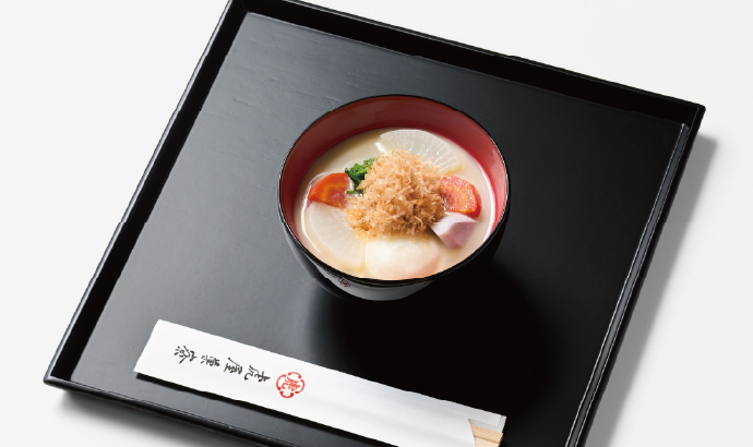 - 京都を発祥の地とするとらやのお雑煮は、白味噌仕立て。甘くとろみのある濃厚な白味噌と、丸餅、えび芋、京人参などでおつくりします。お正月ならではの味をお楽しみください。※「大豆」を含む